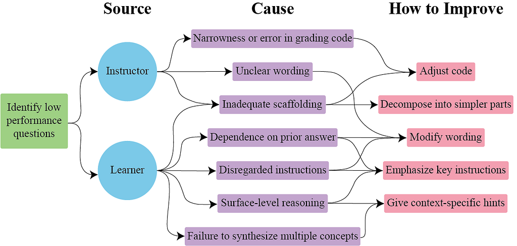 [Alt text for Figure 2: After identifying a low performance question, you hypothesize the source as either the instructor or the learner. A given question can have multiple sources or causes for low performance. Based on the source, there are a few potential causes of low performance to consider. Instructor-based causes are narrowness or error in grading code, unclear wording, and inadequate scaffolding. Learner-based causes are inadequate scaffolding, dependence on prior answer, disregarded instructions, surface-level reasoning, and failure to synthesize multiple concepts. Suggestions for how to improve a question during revision are based on the hypothesized cause. For narrowness or error in grading code you can adjust the code. For unclear wording you can modify the wording. For inadequate scaffolding you can adjust the code or decompose into simpler parts. For dependence on prior answer you can modify the wording or emphasize key instructions. For disregarded instructions you can modify the wording or emphasize key instructions. For surface-level reasoning you can emphasize key instructions or add context-specific hints. For failure to synthesize multiple concepts you can add context-specific hints.]